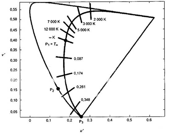 CHÚ THÍCH 2: P2 là giao điểm của quỹ tích phổ của không gian màu u’, v’ và đường tiếp tuyến của quỹ tích Planck tại T¥ theo hướng bước sóng màu xanh.