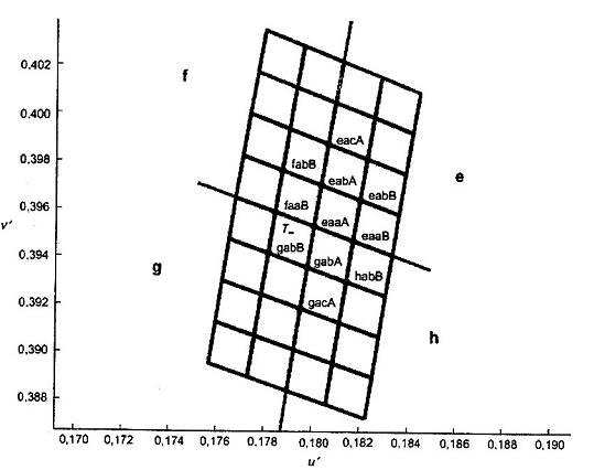 Các nhóm màu trắng được xác định bằng diện tích bên trong tứ giác. Cho trước điểm gốc (p, j) và cỡ bước m, n dọc theo quỹ tích Planck (hoặc kéo dài quá T¥) và các đường Judd tương ứng. Tứ giác được tạo thành bằng cách nối bốn điểm trên lưới