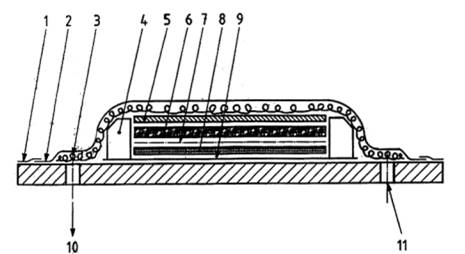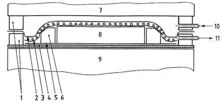 | 1 Thanh dưỡng kim loại (5.2.7) 2 Màng chịu áp (5.2.4) 3 Vật liệu thoát khí (5.2.5) 4 Tấm đế khuôn 5 Màng chống dính (5.2.2) 6 Gioăng cao su (5.2.1) | 7 Tấm đậy khuôn 8 Xếp lớp như trong Hình 3 9 Tấm dưới của máy ép 10 Cung cấp khí nén 11 Nối đến chân không |