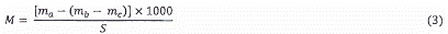 Khi thực hiện qui trình này, xác định khối lượng chính xác của chất mô phỏng được sử dụng bằng chênh lệch khối lượng (Mm). Cho tiếp xúc ba phần chất mô phỏng trắng (chất mô phỏng không có mẫu thử) song song với mẫu thử đã tiếp xúc để được các mẫu trắng mô phỏng.