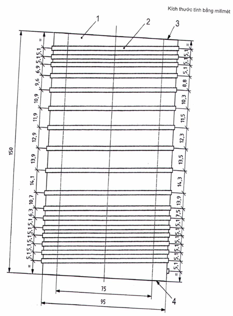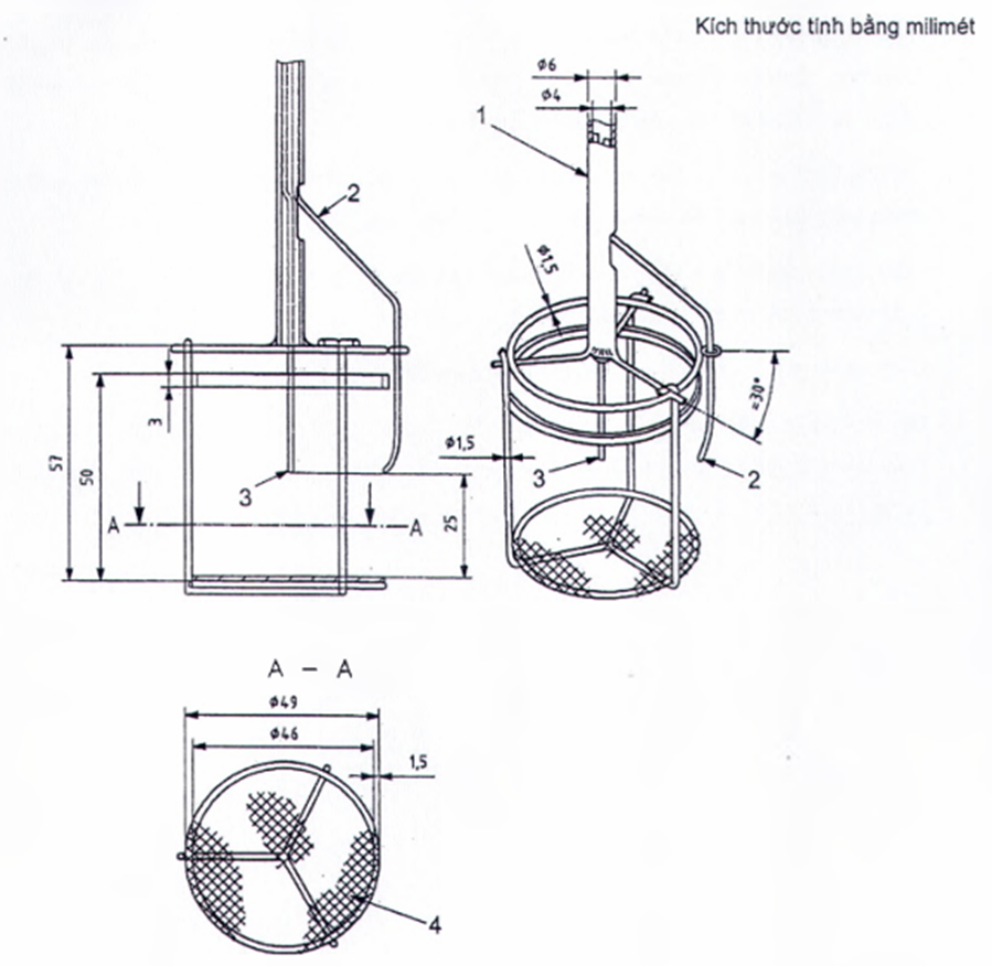 4.3.1 Giá đựng mẫu, quy định trong Hình 1, được chế tạo từ sợi thép bền nhiệt hoặc sợi Niken/Crôm. Dưới đáy của giá đựng mẫu đặt một lưới thép mỏng, bền nhiệt. Khối lượng của giá đựng mẫu khoảng (15 ± 2) g.