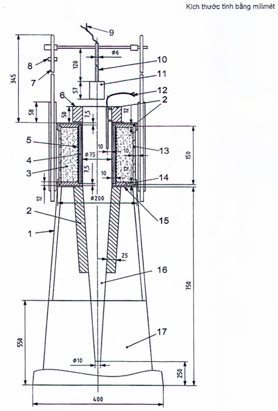 Mặt dưới của ống lò được nối với ống ổn định dòng không khí hình côn dài 500 mm, có đường kính trong giảm đều từ trên là (75 ± 1) mm xuống dưới là (10 ± 0,5) mm. Ống ổn định dòng không khí hình côn được chế tạo từ thép tấm có chiều dày 1 mm, mặt bên trong nhẵn bóng và phía ngoài được cách nhiệt bằng vật liệu cách nhiệt thích hợp.