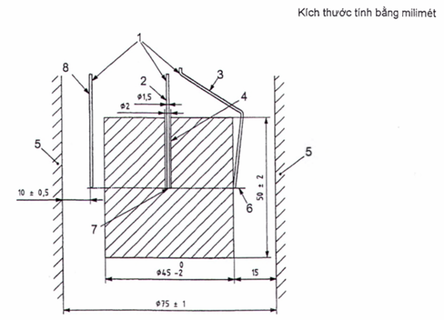 Các cặp nhiệt ngẫu này được định vị sao cho đầu nóng được đặt ở giữa tâm mẫu thử (xem Hình 1 và Hình 2). Để đạt được điều này, phần nửa trên của mẫu thử phải tạo được một lỗ có đường kính 2 mm, bắt đầu từ phần đỉnh mẫu thử chạy dọc xuống.
