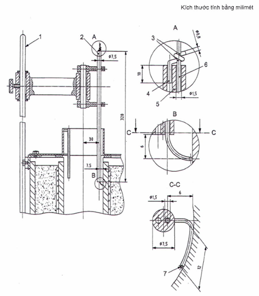 4.3.2 Dụng cụ đưa mẫu vào lò, đảm bảo cho việc hạ thấp giá đựng mẫu vào lò thật nhẹ nhàng và cẩn thận sao cho tâm hình học của mẫu thử trùng tâm hình học của lò trong suốt quá trình thử nghiệm. Dụng cụ đưa mẫu vào lò gồm một que trượt bằng kim loại chuyển động tự do theo thanh dọc định hướng lắp cạnh lò.