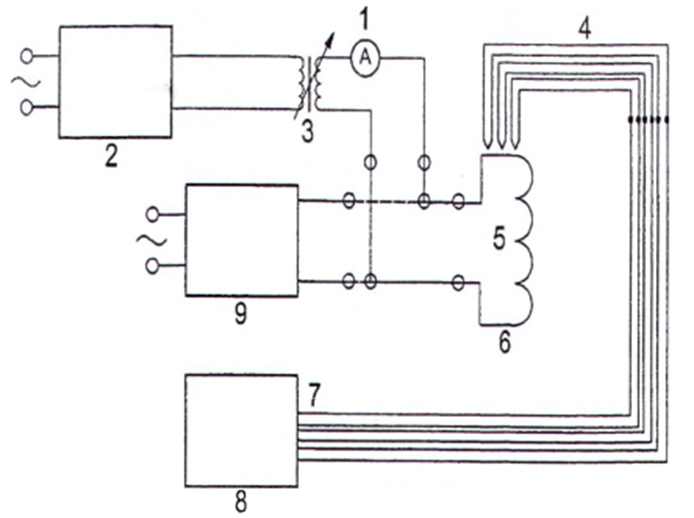 7) Thanh thép chịu nhiệt để đưa mẫu vào lò; 8) Thanh chốt; 9) Cặp nhiệt ngẫu của mẫu thử