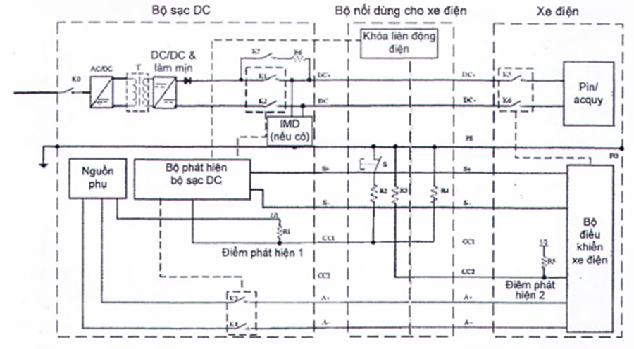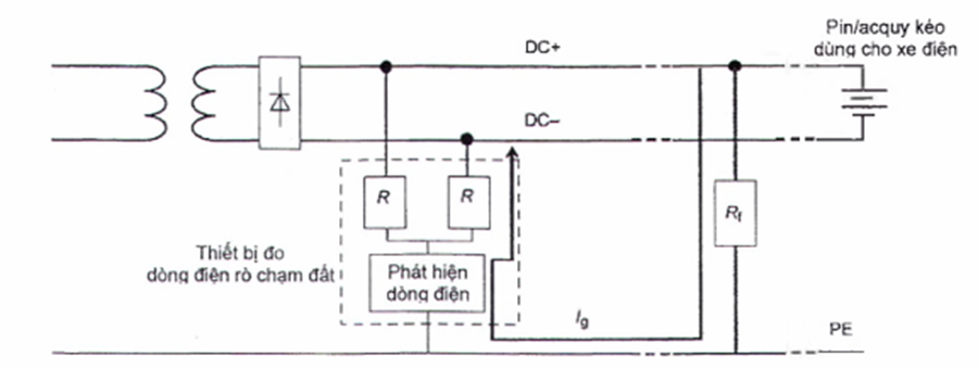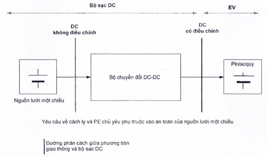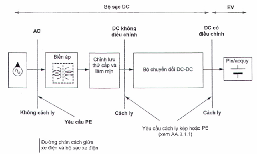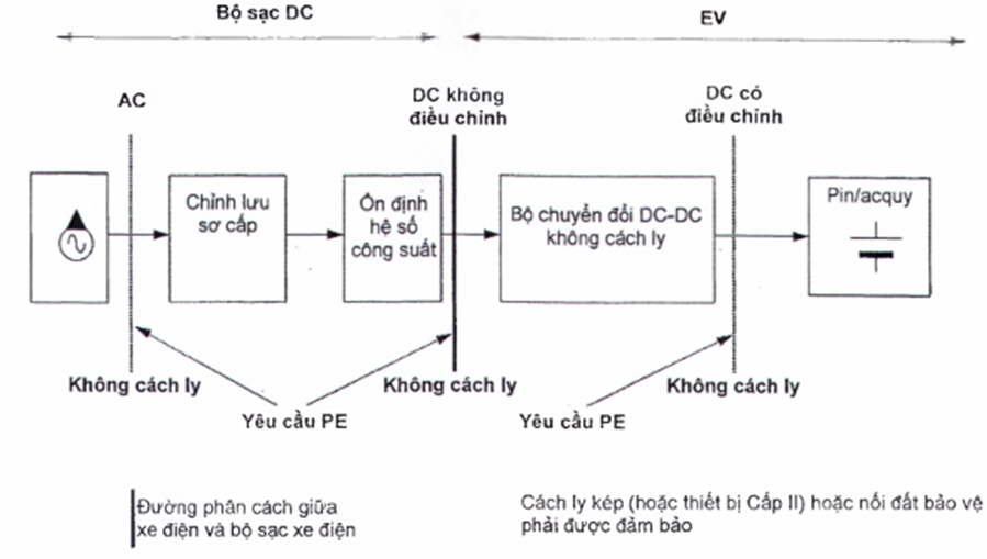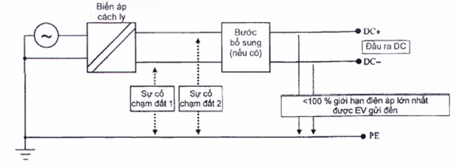 Trạm sạc điện một chiều cho EV có mạch điện một chiều trên phía đầu ra không được phân cách về điện bởi tối thiểu cách điện chính với mạch xoay chiều trên phía hệ thống điện.