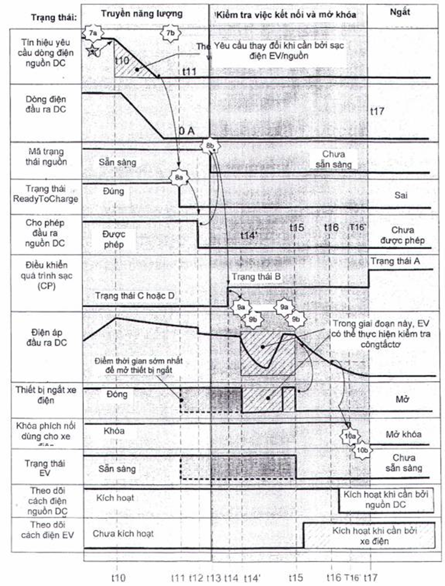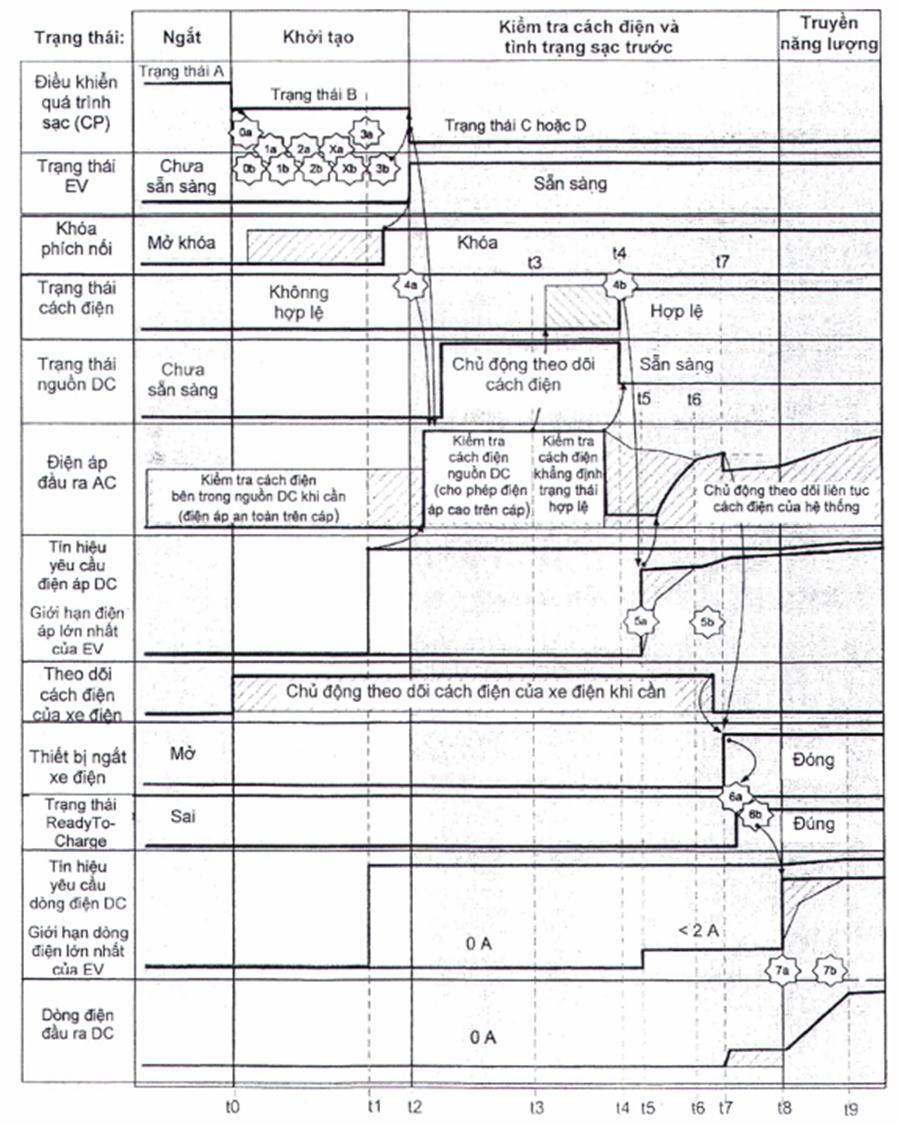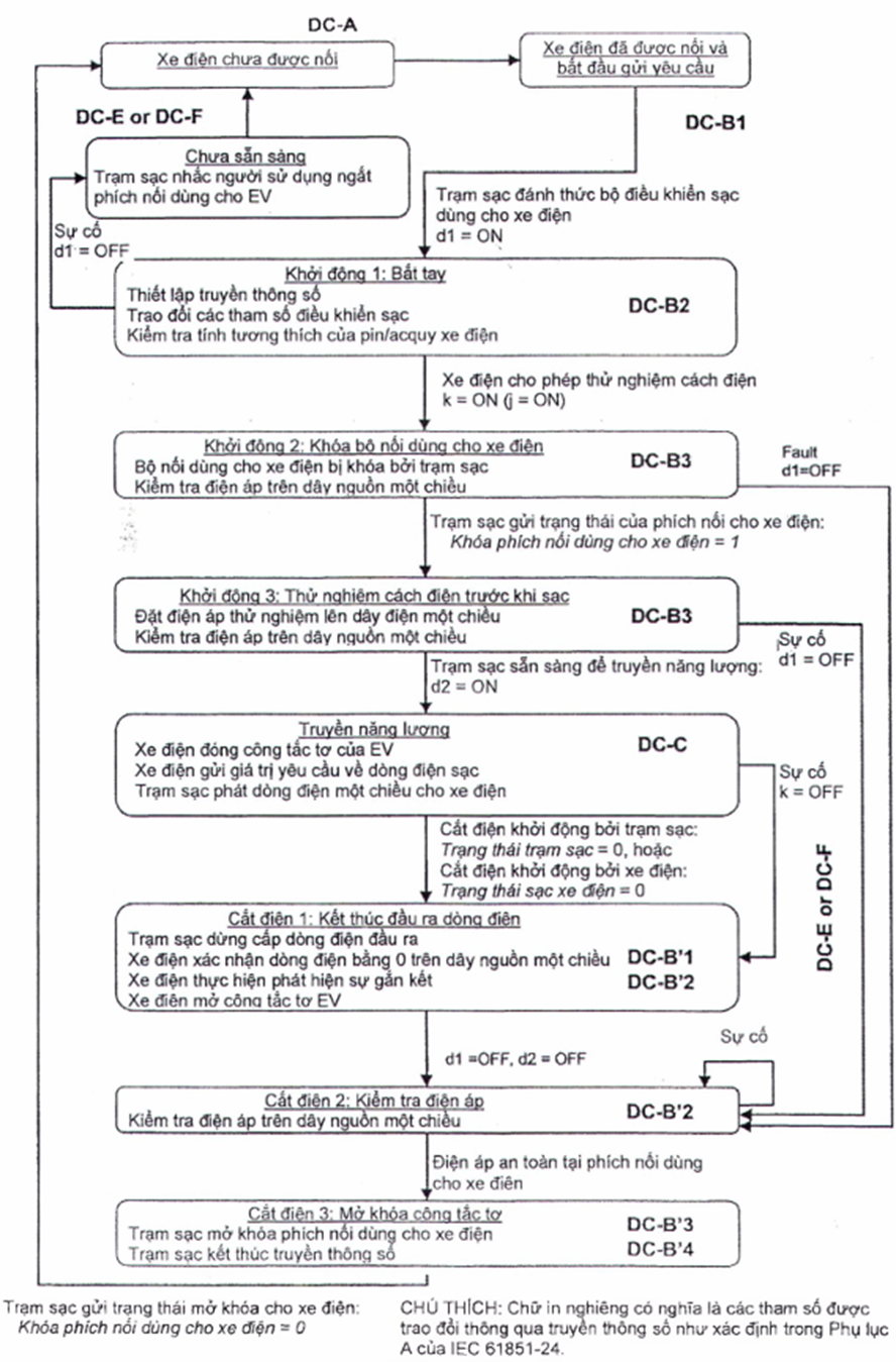 Chu kỳ cấp nguồn chỉ được phép một khi trạm sạc điện một chiều kiểm tra phích nối cấu hình CC đã chốt và chức năng của cơ cấu đóng cắt vị trí chốt (S3) trước khi nối phích nối dùng cho xe điện với ổ nối vào xe điện.
