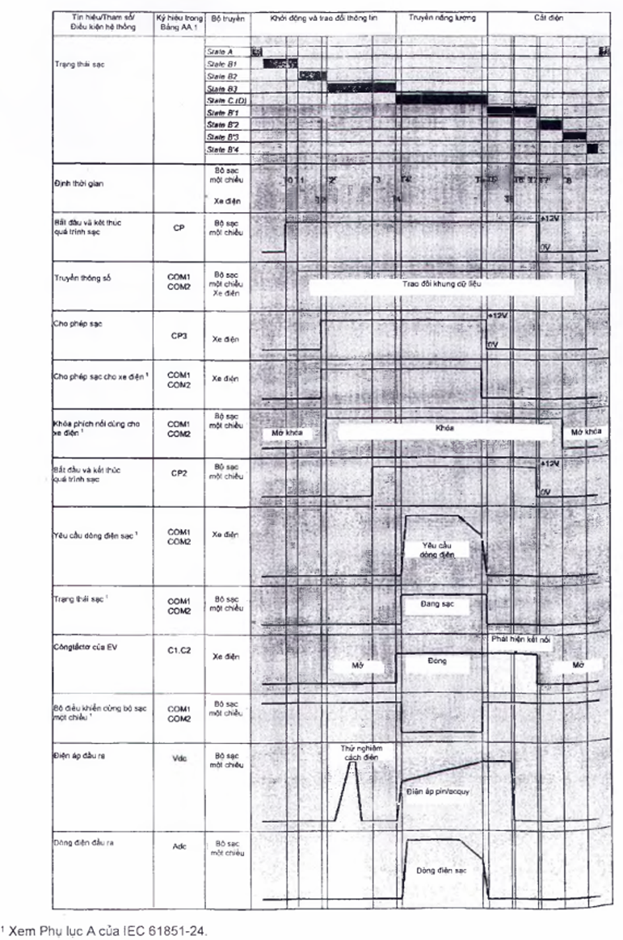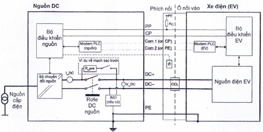 | 5. Truyền thông điều khiển sạc | EV và/hoặc hệ thống nguồn một chiều có thể: a) truyền thông bằng các bản tin số và các tín hiệu tương tự, hoặc b) truyền thông chỉ bằng các tín hiệu tương tự, bằng cách sử dụng: - các tiếp điểm truyền thông dành riêng, hoặc - trên các đường dây điện. |