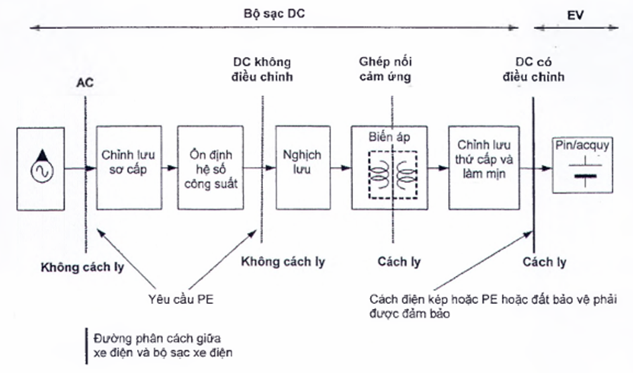 Trạm sạc điện một chiều cho EV có mạch điện một chiều trên phía đầu ra được phân cách về điện bởi tối thiểu cách điện chính với mạch xoay chiều trên phía hệ thống điện.