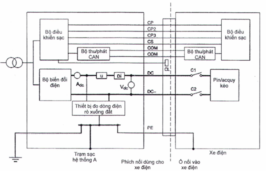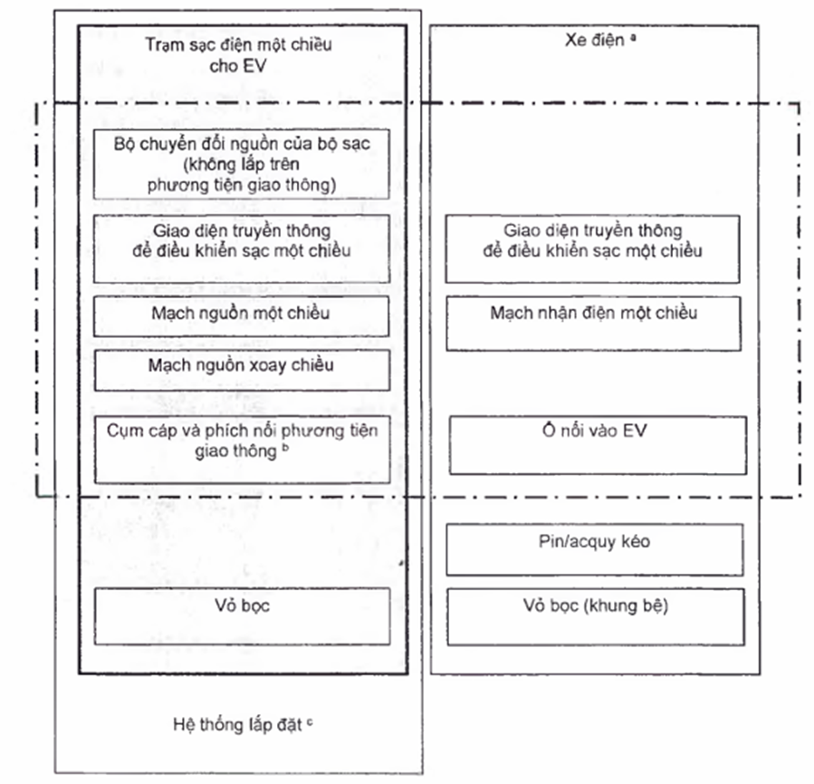 Hệ thống bao gồm bộ sạc một chiều, cụm cáp và thiết bị trên EV cần thiết để thực hiện chức năng sạc điện kể cả truyền thông số để điều khiển việc sạc.