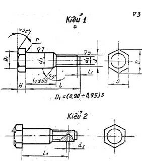 | Đường kính thân bulông d1 Kích thước "lắp chia vặn" S Chiều cao đầu bulông H và chiều dài l1 Đường kính phần lồi d2 Bán kính góc lượn: r < 1 r ≥ 1 Đường kính lỗ ở thân d3 Chiều dài bulông l | B4 theo TCVN 2245 - 77 B7 theo TCVN 2245 - 77 ĐX8 B8 theo TCVN 2245 - 77 B8 theo ГOCT 2245 - 77 B9 theo TCVN 2245 - 77 A8 theo TCVN 2245 - 77 ĐX9 |