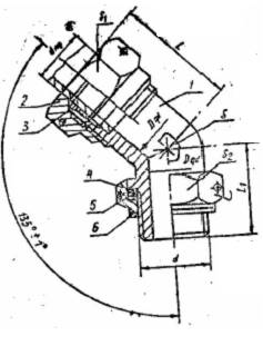 | 1- Phần nối góc theo TCVN 2411:1978; 2- Đai ốc nối theo TCVN 2425:1978; 3- Vòng mím theo TCVN 2424:1978; 4- Đai ốc định vị theo TCVN 2426:1978; 5- Vòng đệm kiểu I theo TCVN 2428:1978; 6- Vòng đệm kiểu II theo TCVN 2428:1978. |