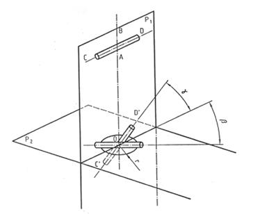 g là góc nằm trong P1. Nếu O’ nằm trên giao tuyến của P1và P2, ó là góc xuyên qua chốt C’D’ có thể xoay trong P1; nếu O’ không nằm trên giao tuyến của P1và P2, g nằm trong mặt phẳng P’ bất kỳ song song với P1và đi qua diện tích của vòng tròn bán kính r và tâm O trong mặt phẳng P2.