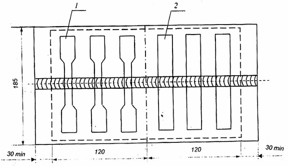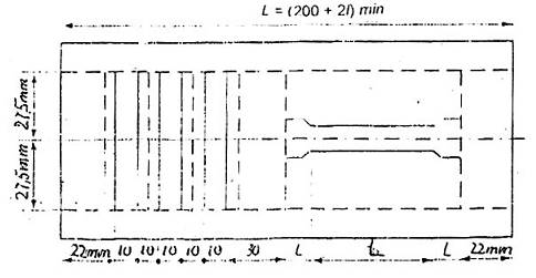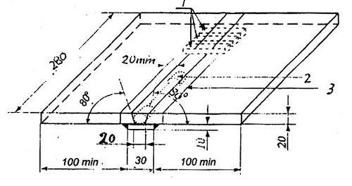- Hàn nối hai tấm thép, phía dưới hai tấm thép đặt một tấm thép lót mỏng, theo hình 3. Mẫu để thử các chỉ tiêu cơ tính được chia từ mẫu hàn nối theo hình 4, hình 5.