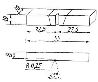 - Hình dáng, kích thước mẫu thử độ dai va đập theo hình 9. Phương pháp thử theo TCVN 312 - 84.
