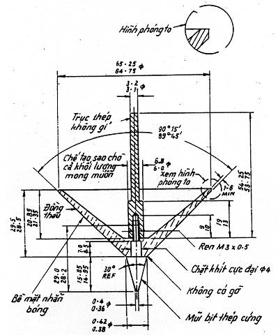 A1.1. Chóp nón tiêu chuẩn: Để xác định độ lún kim tới 475, gồm một vật hình nón được chế tạo từ thép Manhe hoặc vật liệu tương tự, có đỉnh chóp nón bằng thép cứng có thể tháo rời ra được (Hình A.1). Khối lượng toàn bộ chóp nón là 102,5 g ± 0,05 g, khối lượng những phụ tùng tháo lắp được của nó là 47,5 g ± 0,05 g. Những phụ tùng này gồm: Một trục cứng có “một nút bấm” ở khoảng giữa phía trên để gài chóp nón. Chóp nón được cấu tạo sao cho tổng đường viền và sự phân bổ khối lượng không thay đổi. Bề mặt bên ngoài chóp nón phải thật trơn nhẵn.