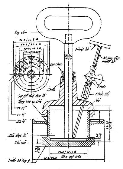 A.1.3. Cối giã mỡ: như vẽ ở Hình A.3. Cối giã được cấu tạo để có thể vận hành hoặc bằng tay hoặc bằng máy. Thiết kế sao cho có được tốc độ 60 ± 10 nhịp giã trong một phút. Một nhiệt kế thích hợp đã tiêu chuẩn hóa ở 25oC, được cài qua lỗ thoát hơi của cối. Nếu vận hành bằng máy, cối được trang bị thêm một máy đếm cho phép thiết bị có thể tự dừng lại sau một số nhịp giã bất kì theo yêu cầu cho tới 99.999 nhịp.