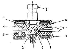 5.2.2. Khuôn dưới phải có một lỗ ở tâm để lắp trục đĩa. Dùng một vòng đệm thích hợp có hệ số ma sát thấp gắn vào lỗ để tránh cao su chảy khỏi hộp khuôn.