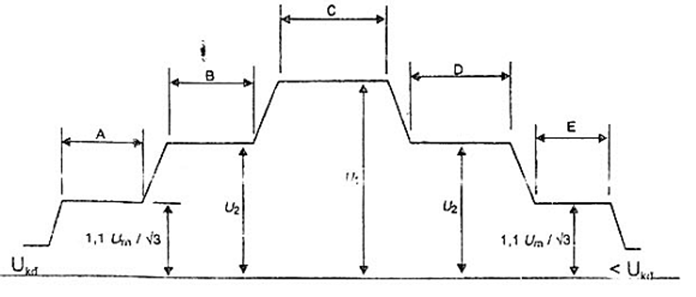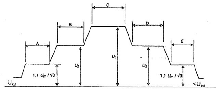 | CHÚ THÍCH 1: Đối với Um = 550 kV và phần Um = 420 kV, mức đánh giá phóng điện cục bộ phải giảm xuống còn 1,2 Um CHÚ THÍCH 2: Khi điện áp chịu thử ACSD U1 nhỏ hơn mức đánh giá phóng điện cục bộ pha-pha U2, U1 phải lấy bằng U2. Khe hở không khí bên trong và bên ngoài phải được thiết kế phù hợp. | ||||