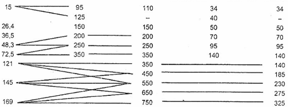 - Điện áp chịu thử danh định tạo thành cấp cách điện cho các đầu nối pha, xem bảng 1.