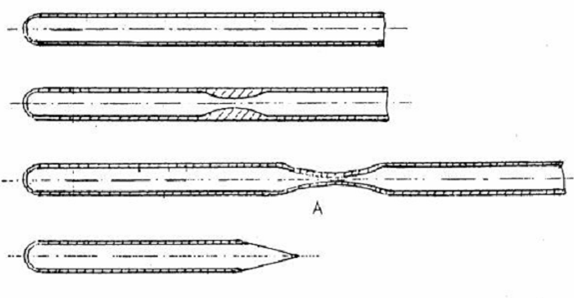 Chú thích - Ống đốt phải được hàn kín với sự giảm độ dày thành ống ít nhất để tránh rò rỉ trong quá trình tách sundonic. Tốt nhất là quay tròn ống từ từ và đốt nó bằng ngọn lửa ooxxi/gaz hoặc gaz/không khí. Ngay khi thủy tinh mềm ra, ép nhẹ hai đầu ống để tăng độ dày của thành ống và kéo dài ra để tạo ống mao quản, và cuối cùng ống được hàn tại điểm A (xem hình 2).