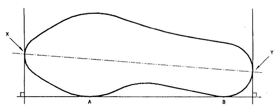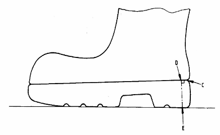 Đo độ dầy tổng cộng của gót DE, như minh hoạ ở Hình A.1, trên mặt cắt bao gồm cả miếng nẹp hoặc vân thẳng góc với bề mặt bên trên của đế trong và lớp độn. Đường đế trong CD dài 10 mm tính từ điểm C là đỉnh của cạnh sau của gót ở phía ngoài. ở những vị trí có tấm độn, đo độ dầy từ phía dưới của tấm đến bề mặt của gót. Tiến hành đo cả ở trên và giữa các vân đế, ở ba vị trí cho mỗi trường hợp, hoặc ở nhiều vị trí tuỳ theo thiết kế của gót cho phép, nếu như ba là không thể được.