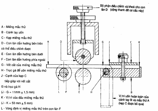 Miếng mẫu thử A được đưa vào đầu chặn của cánh tay uốn B và được giữ bằng bẳng kẹp C, chiều dài JK là 50 mm ± 5 mm. Đầu kia của miếng mẫu thử không phải kẹp mà di chuyển vào ra giữa các con lăn D, E và F khi miếng mẫu thử bị uốn. Việc uốn xảy ra xung quanh trục gá H với bán kính 5,0 mm ± 0,3 mm.