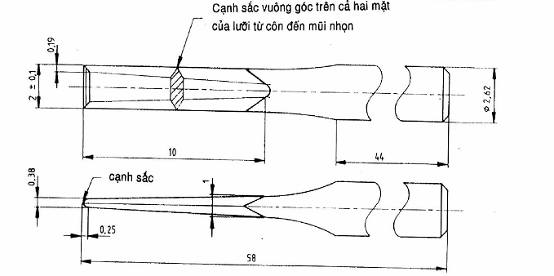 Để tạo nên vết cắt ban đầu ở các mẫu thử như minh hoạ ở Hình C.2. Cạnh cắt dài 2 mm, nhưng thông thường thì chiều dài cắt tạo ra trong vật liệu có khác một ít. Để thuận tiện cho việc đưa vết cắt vào đúng vị trí phải giữ đục trong gá cắt.