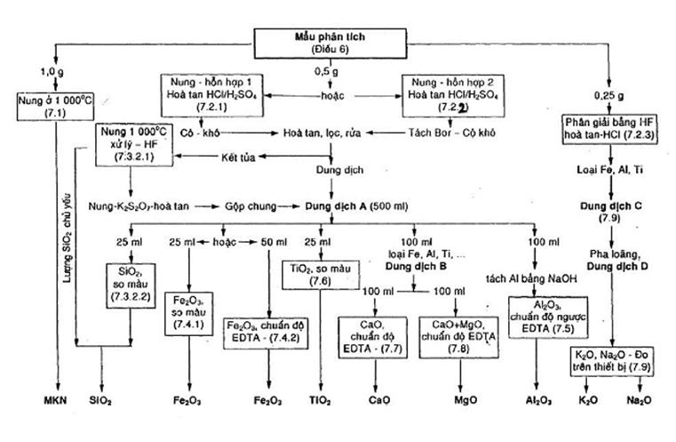 Hòa tan mẫu thử thành dung dịch và loại bớt các nguyên tố cản trở (sắt, nhôm, titan,…) bằng cách kết tủa trong môi trường kiềm amoniac, thu lấy dung dịch lọc. Xác định hàm lượng các oxit kim loại kiềm có trong dung dịch lọc bằng một trong hai loại thiết bị sau: