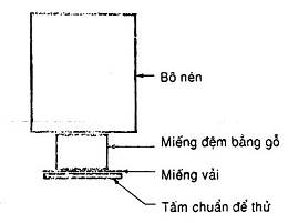 Đặt tấm mẫu thử lên nền phẳng, rắc một lớp cát phủ kín bề mặt màng sơn, đặt miếng vải lên lớp cát, trên là miếng đệm gỗ, sau đó đặt bộ nén lên trên miếng đệm gỗ (hình 1).
