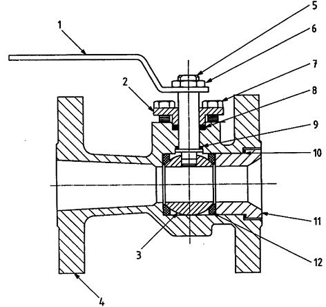 | CHÚ DẪN: 1 Tay cầm (cần gạt) 2 Đệm tỳ 3 Bi 4 Thân 5 Trụ van 6 Đai ốc trụ van | 7 Bu lông đệm tỳ 8 Đệm kín thân trụ ren 9 Phớt chặn 10 Đệm thân 11 Thân chèn 12 Vòng bít kín |