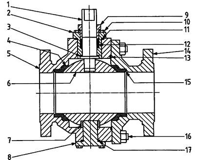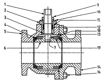 | CHÚ DẪN: 1 Trụ van 2 Nắp đậy 3 Phớt chặn 4 Bít kín 5 Thân van 6 Bi 7 Ổ đỡ trụ xoay 8 Trụ xoay 9 Đệm tỳ 10 Bu lông nắp đậy | 11 Gioăng kín nắp đậy 12 Phớt trụ thân van 13 Đệm kín thân van 14 Nắp thân 15 Lò xo đệm kín 16 Bu lông lắp thân 17 Đệm kín trụ xoay 18 Mặt phẳng ngõng trục 19 Vòng cách của ổ |