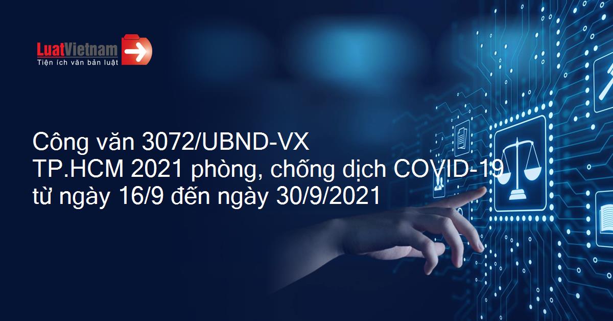 | ỦY BAN NHÂN DÂN THÀNH PHỐ HỒ CHÍ MINH _________ Số: 3072/UBND-VX Về thực hiện các biện pháp phòng, chống dịch COVID-19 trên địa bàn Thành phố từ ngày 16 tháng 9 đến ngày 30 tháng 9 năm 2021 | CỘNG HÒA XÃ HỘI CHỦ NGHĨA VIỆT NAM Độc lập - Tự do - Hạnh phúc _______________________ Thành phố Hồ Chí Minh, ngày 15 tháng 9 năm 2021 |