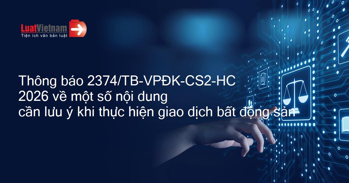 Thông báo 2374/TB-VPĐK-CS2-HC 2026 về một số nội dung cần lưu ý khi thực hiện giao dịch bất động sản