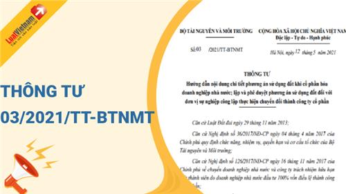 Ngày 12/5/2021, Bộ Tài nguyên và Môi trường đã ban hành Thông tư 03/2021/TT-BTNMT về việc hướng dẫn nội dung chi tiết phương án sử dụng đất khi cổ phần hóa doanh nghiệp Nhà nước; lập và phê duyệt phương án sử dụng đất đối với đơn vị sự nghiệp công lập thực hiện chuyển đổi thành công ty cổ phần.