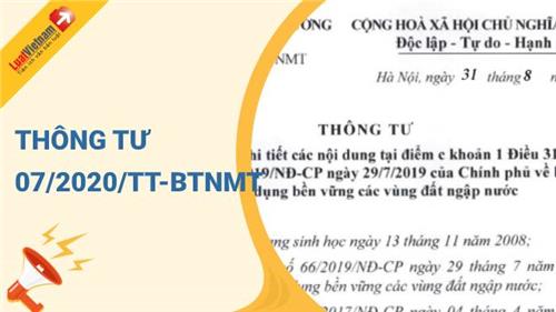 Ngày 31/8/2020, Bộ Tài nguyên và Môi trường ban hành Thông tư 07/2020/TT-BTNMT về việc quy định chi tiết các nội dung tại điểm c khoản 1 Điều 31 Nghị định 66/2019/NĐ-CP ngày 29/7/2019 của Chính phủ về bảo tồn và sử dụng bền vững các vùng đất ngập nước.