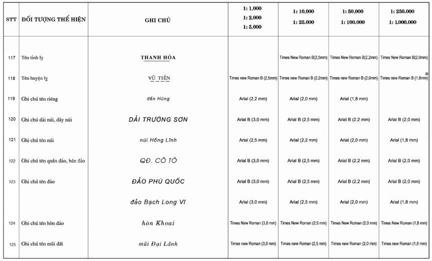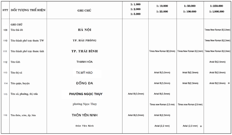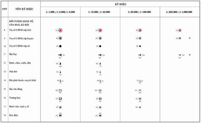 đ) Các yếu tố kinh tế, xã hội thể hiện tên các địa danh, trụ sở cơ quan chính quyền các cấp; tên công trình hạ tầng và các đối tượng khác;