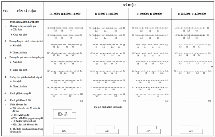 Việc thể hiện yếu tố địa giới hành chính các cấp trên bản đồ sử dụng để điều tra kiểm kê đất đai dạng số phải đáp ứng các yêu cầu tự động hóa trong tính toán, thống kê báo cáo diện tích các loại đất, cho phép kiểm tra sự phù hợp về số liệu thống kê loại đất từ cấp xã đến cấp tỉnh và cả nước. Khi đường địa giới đơn vị hành chính các cấp trùng nhau thì ưu tiên biểu thị đường địa giới đơn vị hành chính cấp cao nhất.