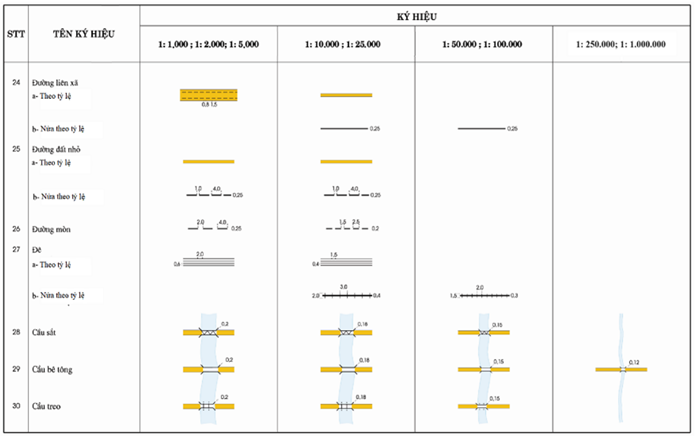 a) Ranh giới công trình thủy lợi, giao thông thể hiện theo đường chân Taluy (đối với công trình đắp cao) hoặc theo đường đỉnh Taluy (đối với công trình đào sâu);