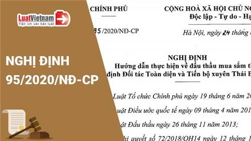 Ngày 25/8/2020, Chính phủ ban hành Nghị định 95/2020/NĐ-CP về việc hướng dẫn thực hiện về đấu thầu mua sắm theo Hiệp định Đối tác Toàn diện và Tiến bộ xuyên Thái Bình Dương.