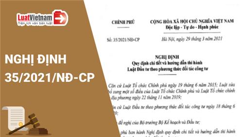 Ngày 29/3/2021, Chính phủ ban hành Nghị định 35/2021/NĐ-CP về việc quy định chi tiết và hướng dẫn thi hành Luật Đầu tư theo phương thức đối tác công tư.