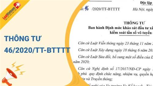 Ngày 31/12/2020, Bộ Thông tin và Truyền thông đã ra Thông tư 46/2020/TT-BTTTT về việc ban hành Định mức khảo sát đầu tư xây dựng hệ thống kiểm soát tần số vô tuyến điện.