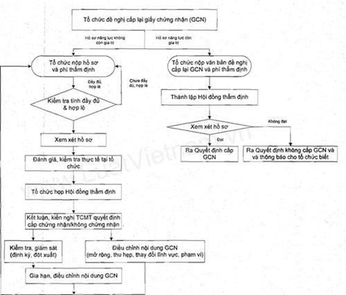 Sơ đồ biểu diễn quy trình thẩm định điều kiện của tổ chức hoạt động dịch vụ quan trắc môi trường phục vụ việc cấp lại Giấy chứng nhận được trình bày tại Phụ lục 3 ban hành kèm theo Thông tư này.