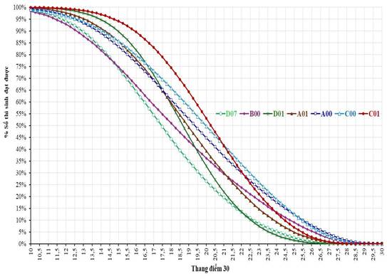 Biểu đồ 1. Phố điểm tích lũy 7 khối thi tốt nghiệp năm 2025.