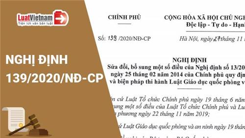 Nghị định 139/2020/NĐ-CP sửa đổi, bổ sung Nghị định 13/2014/NĐ-CP hướng dẫn Luật Giáo dục quốc phòng và an ninh