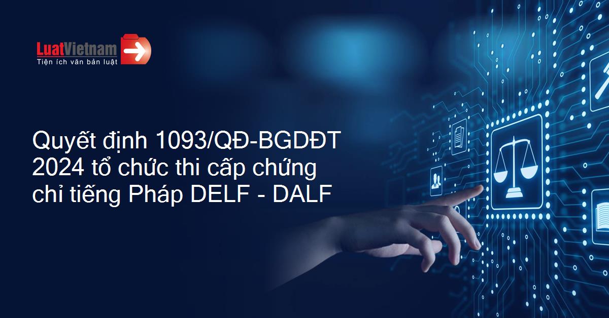 Quyết định số 1093/QĐ-BGDĐT được Bộ Giáo dục và Đào tạo ban hành ngày 09 tháng 04 năm 2024, có hiệu lực ngay sau khi ký. Quyết định này phê duyệt việc liên kết tổ chức thi cấp chứng chỉ tiếng Pháp DELF - DALF giữa Trường Đại học Sư phạm Thành phố Hồ Chí Minh, Viện Pháp tại Việt Nam và Tổ chức Giáo dục quốc tế Pháp.