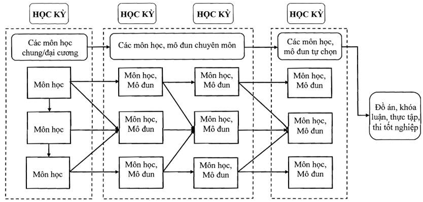 Chương trình đào tạo phải xác định được danh mục và thời lượng của từng môn học, mô đun tương ứng với phương thức đào tạo; thời gian học lý thuyết và thời gian học thực hành, thực tập; bảo đảm tính khoa học, hệ thống, thực tiễn và linh hoạt, đáp ứng sự thay đổi của kỹ thuật công nghệ và thị trường lao động; bảo đảm việc liên thông giữa các trình độ đào tạo trong hệ thống giáo dục quốc dân…