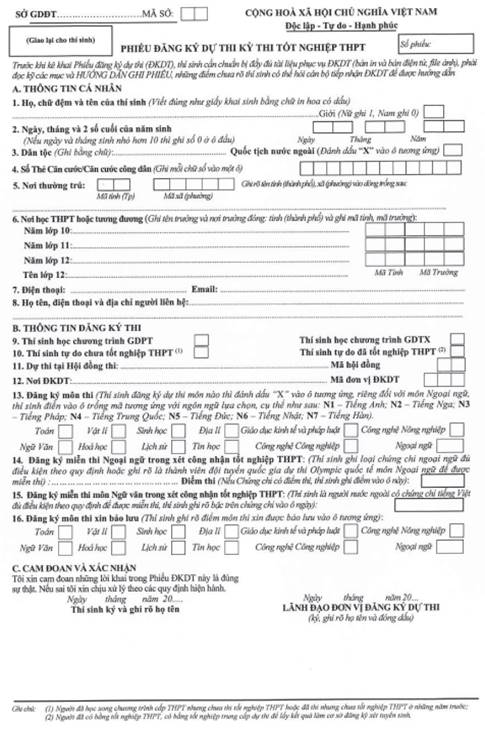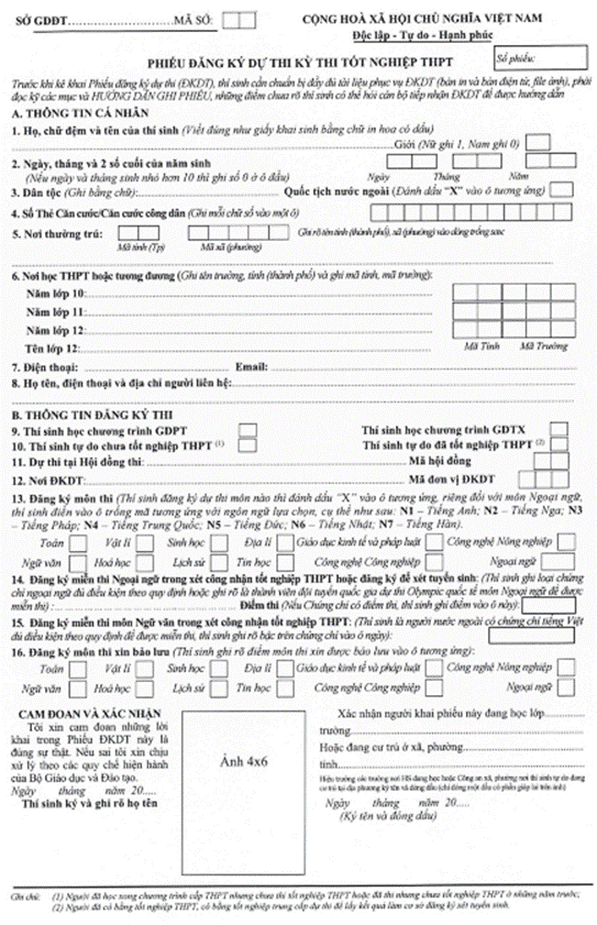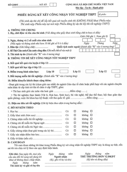 MẪU PHIẾU ĐĂNG KÝ XÉT CÔNG NHẬN TỐT NGHIỆP THPT