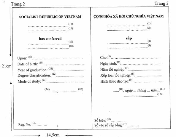 (15), (16) Ghi chức danh của thủ trưởng cơ sở giáo dục và tên cơ sở giáo dục có thẩm quyền cấp bằng tốt nghiệp đại học, bằng tiếng Anh.