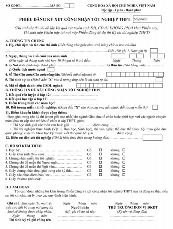 MẪU PHIẾU ĐĂNG KÝ XÉT CÔNG NHẬN TỐT NGHIỆP THPT
